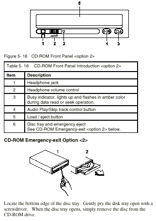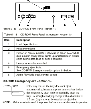 ATTENTION: Either <option 1> or <option 2> CD-ROM drive may come with your Aptiva machine. Their front panel buttons, indicators and emergency eject method may be different. The rear panel on both <option1> and <option 2> drives are the same.