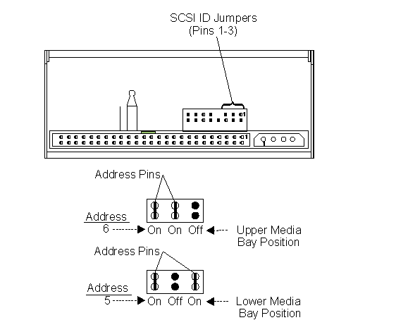 2. Use the address pin jumpers provided with the tape drive to connect the upper and lower pins that correspond to the SCSI ID you want to use, as illustrated.