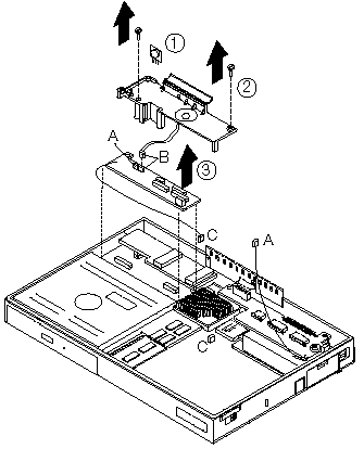 During replacement, make sure the microphone (A), speaker (B) and sound card (C) cable connections are correct.