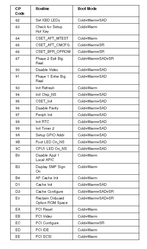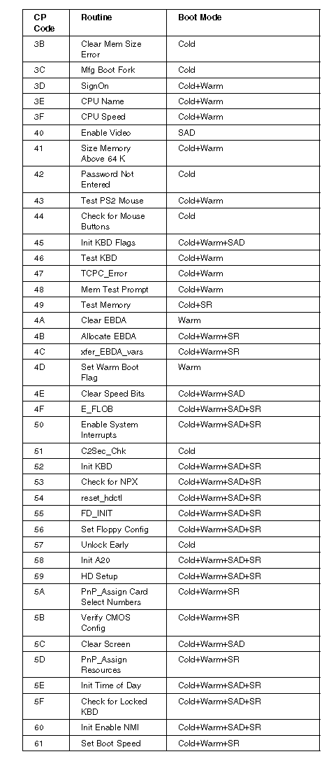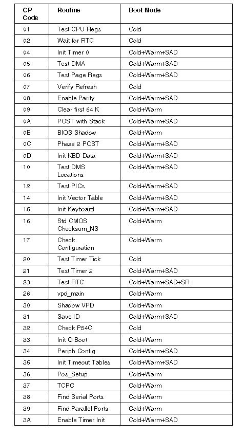 During POST, the computer displays the status of the components being tested in the form of Checkpoint (CP) codes in the lower right-hand corner of the screen. The following is a list of the CP codes followed by the routine in process and the boot mode.