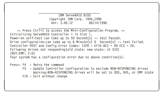 3. Refer to "ServeRAID Startup Messages". Note the resulting BCS and or ECS Error codes, and see the FRU actions respective to those codes. (EF10 is a default code for ISPR indicating that there is no ISPR error present.)