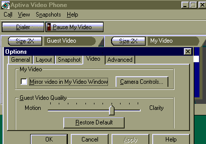 Note: This procedure allows the resetting of the Aptiva Video Phone for incoming Guest Video Quality. It will reset the video quality that you receive and is shown in the guest video section. Video quality depends upon the speed of the modem, applications running, video window size, and telephone lines. The figures shown below have been modified to better focus on the image details and to shrink the file size.