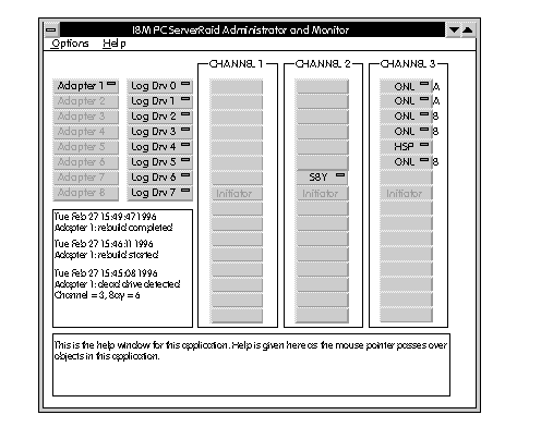 The Client program includes many of the functions contained in the ServeRAID configuration program. Because it resides on top of the operating system, you do not need to restart the server to add and remove capacity dynamically when creating or deleting an array. You can start the Administration and Monitoring program from the active operating system desktop.