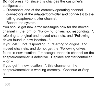 If you get the "...drives not responding" message, and do not get the "Following drives found in new location...", there is a problem on the SCSI channel outboard of the adapter/controller that prevents the adapter/controller from communicating with the devices attached to that channel.