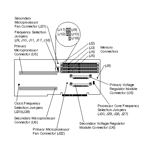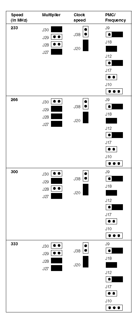 Microprocessor memory controller (PMC) frequency selection jumper block. The default setting is 66.66 MHz. |