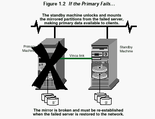 If the primary server fails for any reason becoming inaccessible to the standby machine via either the main network or the Vinca link the standby machine offers the failed server's data to clients as though it were the failed server. Clients can continue to access data after only a short pause as the failover happens.