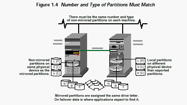 In this example (Figure 1.4) the boot device in each machine has three local partitions, one primary partition and two logical partitions. It doesn't matter that these partitions be on the same disk or that there be an equivalent number of disks in each machine. All that is important is that the number and type of non-mirrored partitions be the same in each machine so that the operating system assigns the same drive letter designation to both halves of the mirror. This ensures that data is still accessible after failover.