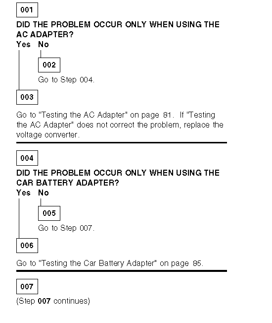 If the voltage is not greater than that measured in Step 5, replace the AC adapter, then go to the next step. If the voltage is greater than that measured in Step 5, the battery pack is good. Repeat Steps 6 and 7 using a new AC adapter. If the voltage is still not greater than that measured in Step 5, replace the voltage converter.
