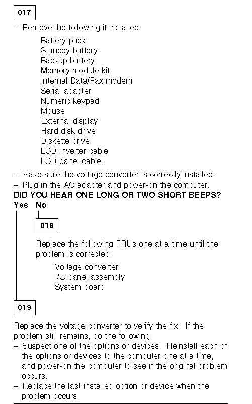 If all the voltages are correct, the voltage converter is good. If+ 20 V dc is not correct, check the output voltage of the AC adapter (see ¿Testing the AC Adapter—). If the voltage is correct, replace the voltage converter. If any of the measured voltages except+ 20 V dc is not correct, replace the following FRUs one at a time to correct the problem.