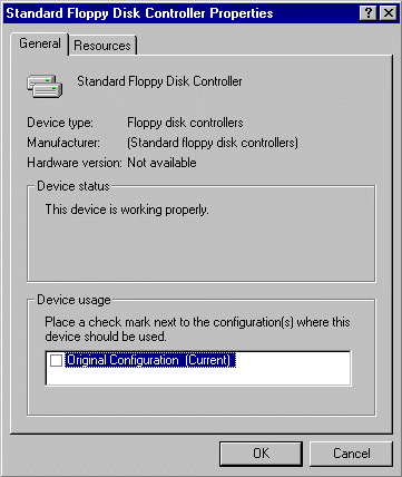 5) In the STANDARD FLOPPY DISK CONTROLLER PROPERTIES window you will see a check box next to "Original Configuration (Current)." Click this check box so that the check mark disappears as seen below.