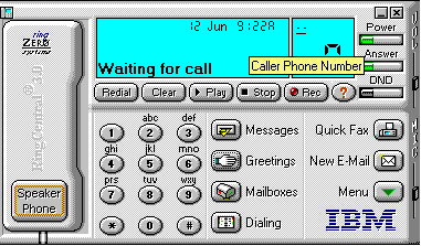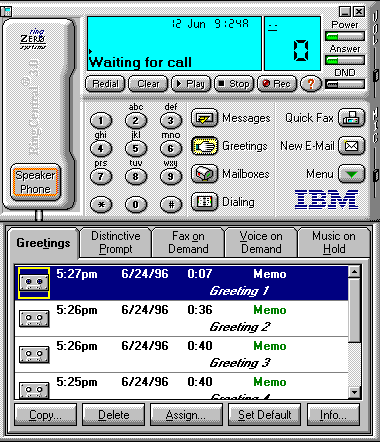This is the ready state of Ring Central. As long as it is running, either minimized or maximized, you will be able to receive voice-mail or Faxes. To play or select one of the pre-recorded messages, click on the "Greetings" button on the main menu. A list of the available greetings is now visible. They may be selected, then played, by clicking on the "Play" button. A greeting may also be set as default greeting by selecting it and clicking on the "Set Default" button. The default greeting will be displayed with a yellow border around it (see Figure - 2).