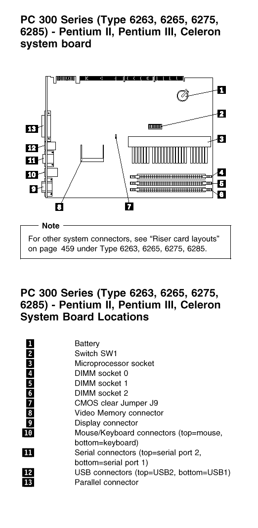 IBM PC300GL (Type 6263, 6265,6275, 6285) - System Board Diagram/Locations