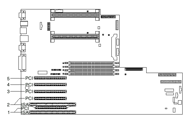 The following figure shows the location of the PCI and ISA expansion slot connectors on the system board.