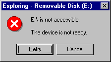 Lockups due to Connection Problems - If the connection to the ZIP drive has been severed (loss of power to the unit, signal cable disconnected, etc.) after the computer has loaded the ZIP drive drivers and the user attempts to access the ZIP drive, the computer will completely lock up. For example, clicking on the ZIP drive in Windows Explorer when no connection exists will lock the computer with an hour glass. The lockup can be freed up if the connection is restored, but a random error (such as the one listed below) will occur if the connection is lost for a significant period of time (several minutes):