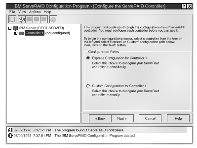 - If the configuration program detects unconfigured ServeRAID controllers, the program starts in the Configuration mode and a screen similar to the following appears.