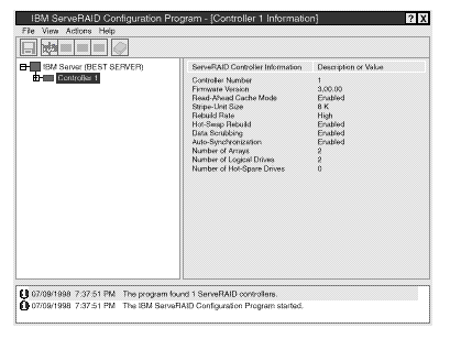 - If the configuration program detects that all ServeRAID adapters or controllers in the server are configured, the program starts in the Information mode and a screen similar to the following appears.