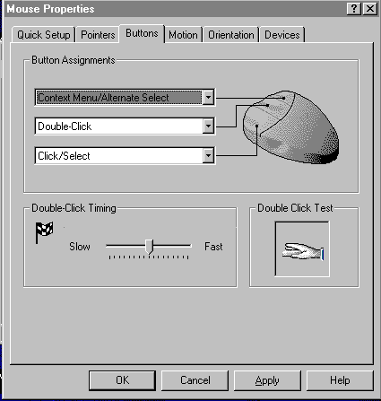 1. Buttons - Allows the user to define Right-Handed or Left-handed configurations, and allows adjustment of the double click speed. If the speed is set to fast, the user has to click the button more rapidly to get the desired response. Conversely, if the speed is set too slow, the user will not get the double click effect even with slower clicks on the mouse.