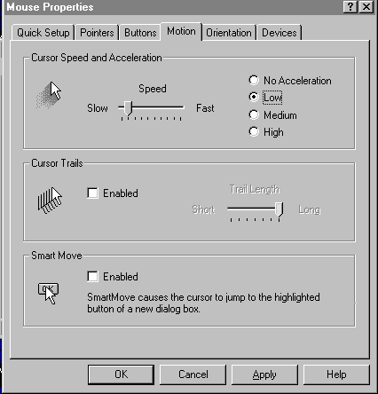 4. Motion - Allows the user to adjust the speed that the pointer moves across the screen, and the size of the trail behind the pointer. The option to automatically have the pointer move to the highlighted button in a new dialog box is also available.