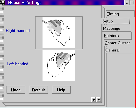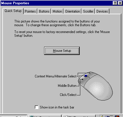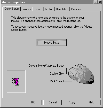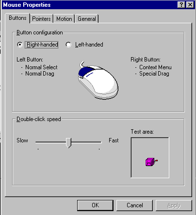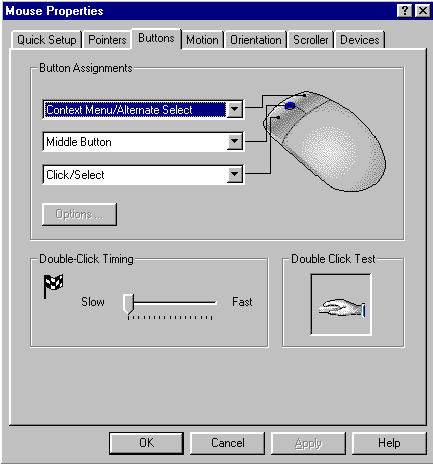 3. Buttons - Allows the user to define Right-Handed or Left-handed configurations, and allows adjustment of the double click speed. If the speed is set to fast, the user has to click the button more rapidly to get the desired response. Conversly, if the speed is set to slow, the user can get the double click effect even with slower clicks on the mouse. The user can also adjust the scroll point on the mouse.