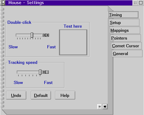 Double Click Speed - Controls how fast the user has to click on the mouse button to get the Double Click effect. If the speed is set to fast, the user has to click the button more rapidly to get the desired response. Conversely, if the speed is set to slow, the user can get the double click effect even with slower clicks on the mouse.