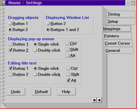 Mappings - Here the user can define which mouse buttons perform what task. The user can also determine whether it takes one or two clicks to perform a task. These tasks are: Dragging Objects, Displaying windows list, Displaying pop-up menus, and Editing title text.
