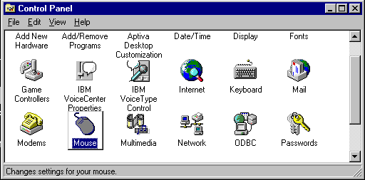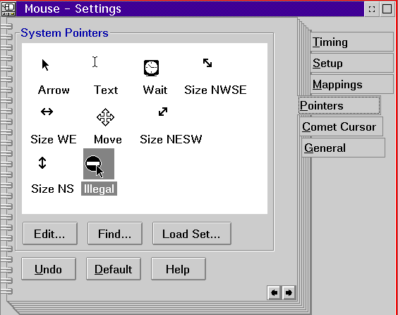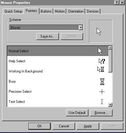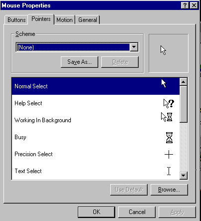 2. Pointers - Allows the user to adjust what the mouse pointers look like for specific situations. The user can also choose from different Windows 95 Schemes for the mouse pointers.