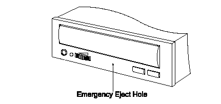If for any reason the tray does not eject automatically, insert and press an eject-bar inside the emergency eject hole to manually eject the tray. A straightened paper clip with a diameter of 1.2 mm (typical) can be used as an eject-bar.
