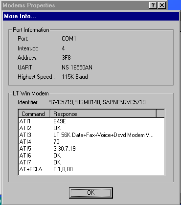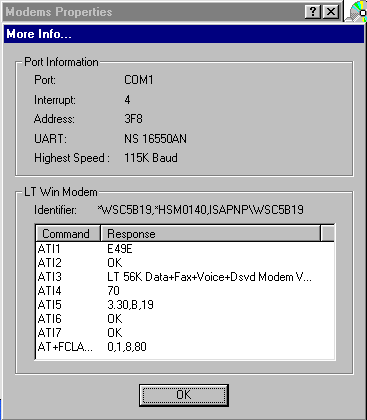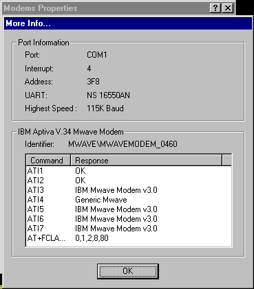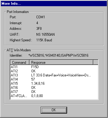 2. Click on the "Diagnostics" tab at the top of the screen. Make sure "COM1" is highlighted, then on the "More Info" button. The following are the screens that should be seen with the respective models.