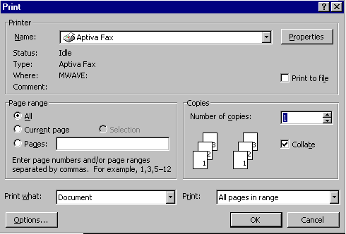 In the box to the right of "name", make sure that "Aptiva Fax" is present. If it is not, then click on the down arrow on the right side of the box. In the menu that pops down, click on "Aptiva Fax". This will redirect the document to the fax modem instead of the printer.