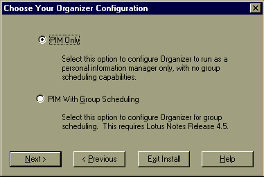 9. Your next screen will allow you to select either PIM Only or PIM With Group Scheduling. PIM with Group Scheduling will be used only if you are going to Sync with Lotus Notes. You need to be using Lotus Notes version 4.5 or higher. If the you select PIM With Group Scheduling and do not have Lotus Notes installed, you will see the following screen. Select PIM Only and then select Next.