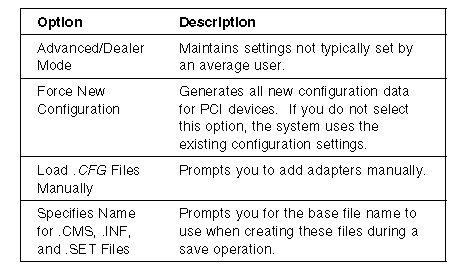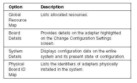 Advanced Options: Press F9 to display the Advanced Options Menu screen from the Change Configuration Settings choice. This screen provides options to display configuration data. You can select the following choices:
