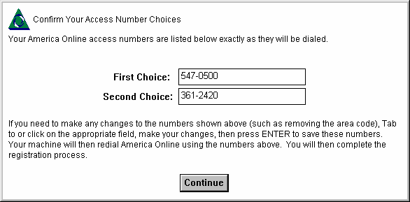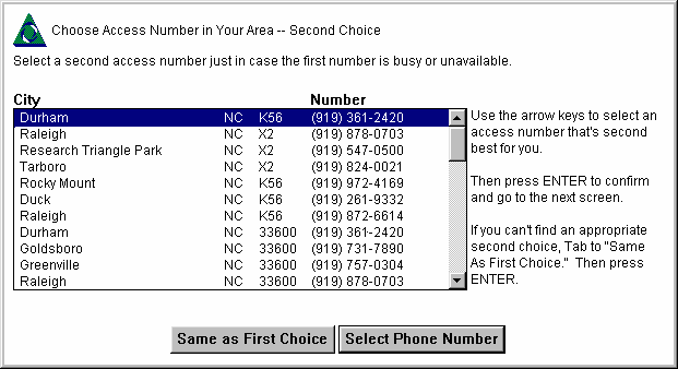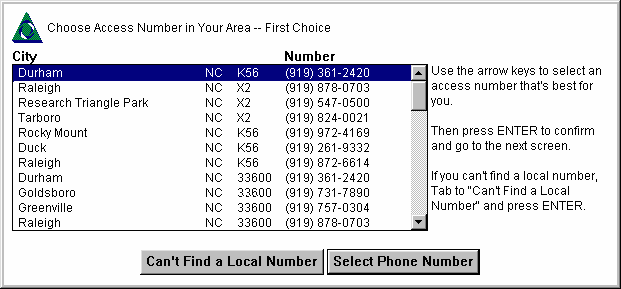Note: If the number you choose is not local, regular long distance rates for your area will apply. If you can't find a local number, click that button and read the information provided very carefully.