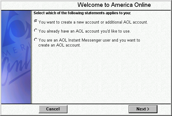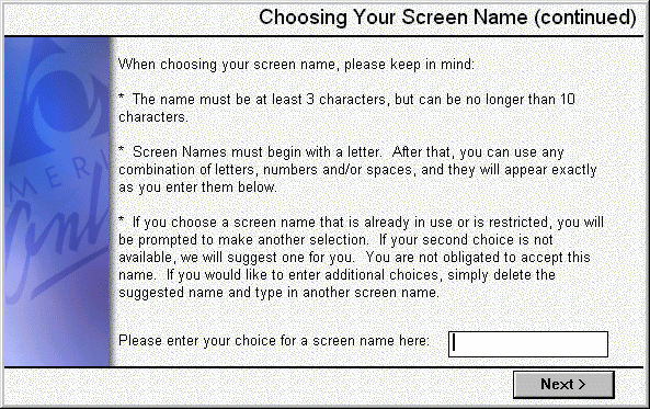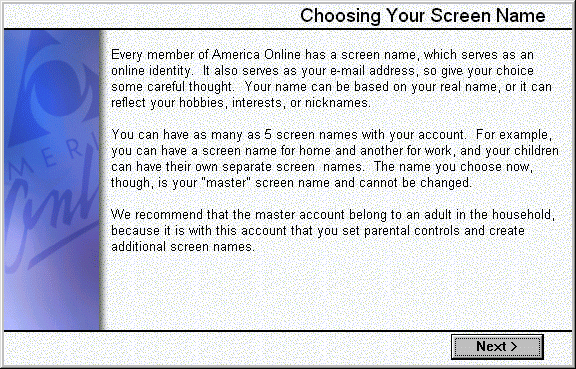 Your Screen Name is your identity on America Online. It becomes your e-mail address and is how you are identified when on the service. Though you may have up to 5 screen names with each AOL account, this first screen name is the "master" screen name and cannot be changed.