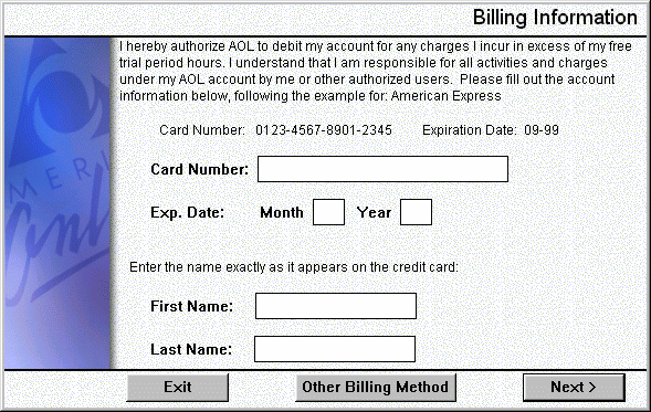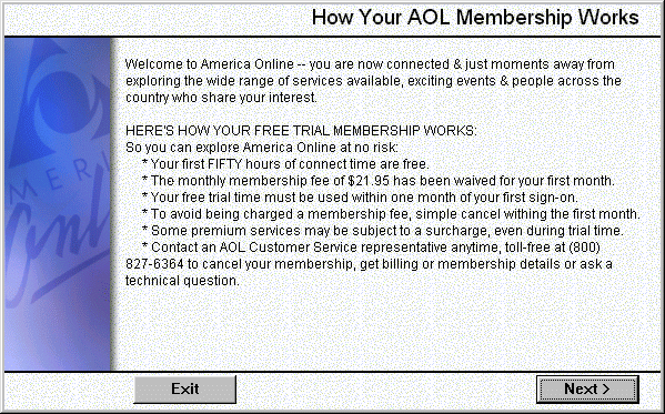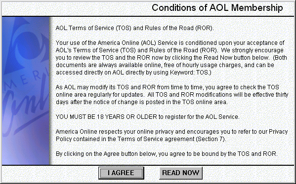 Please read the terms of membership carefully. For any questions regarding AOL's membership or billing practices, please contact AOL customer service at 800-827-6364.