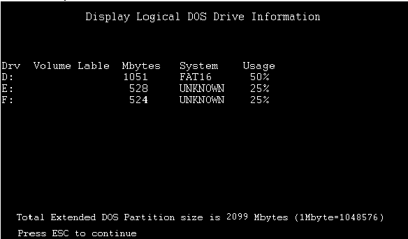 8. At the FDISK Options Screen, enter choice '4' and press 'Enter' key. This will bring you to the 'Display Partition Information' screen. Earlier models usually only have one partition and will have no option for EXT DOS information.
