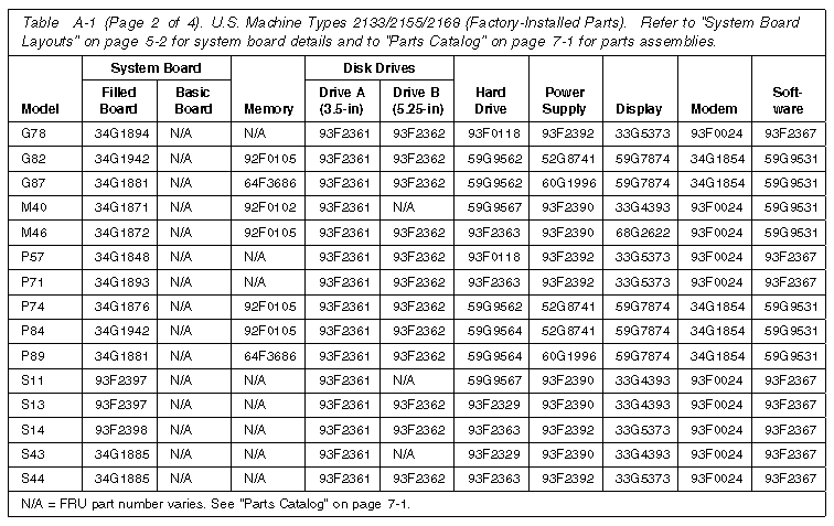 PS/1 - FRU Part Numbers for US M/T 2133, 2155, 2168