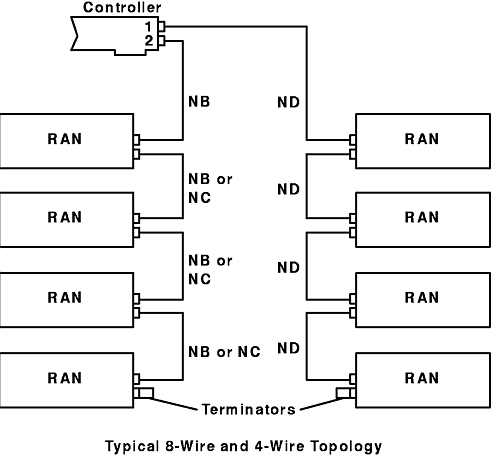 4-wire direct wiring can be used to connect RANs where longer synchronous cable runs are necessary. While not as fast as 8-wire connections (the maximum data transfer rate is 460 Kbps), this wiring method is more economical and is sufficient in all but the most demanding high-performance applications (terminal users should see no degradation in performance). In the 4-wire direct-wiring mode, the clock signals are encoded with the receive and transmit data signals (non-return-to-zero inverted encoding at 230 Kbps and FM0 encoding at 460 Kbps), so only two twisted pairs are required.