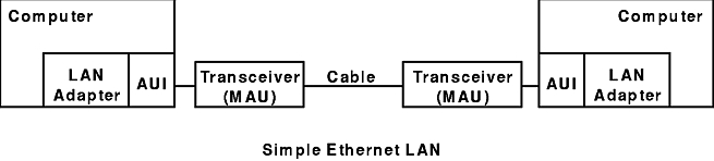 The LAN adapter provides the interface between the computer and the Ethernet. The transceiver, also called a medium attachment unit (MAU), provides the physical interface to the LAN medium. The interface between the LAN adapter and transceiver is the adapter unit interface (AUI). This interface has a standard connector (DB-15 with slide latches) and electrical characteristics. The Ethernet medium is a cable. The type of cable depends on the type of Ethernet.