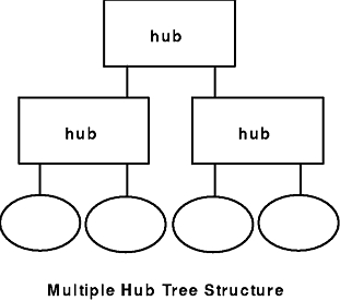 A 7318 can act as a one-port hub or as a client to a hub (similar to PCs or servers). A normal 10Base-T hub provides a fixed number of ports, such as 16. You can expand the total number of ports on a network by attaching multiple hubs together. When attaching hubs together, you can use twisted-pair (10Base-T technology) or coaxial (10Base-2 or 10Base-5 technology) cable. When connecting multiple hubs, the network is usually organized in a tree, as illustrated in the Multiple Hub Tree Structure figure.
