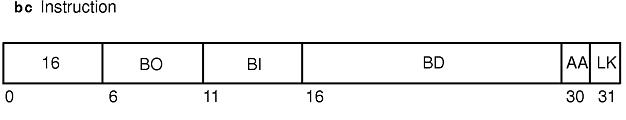 The four syntax forms of the bc instruction never affect the Fixed-Point Exception Register or Condition Register Field 0. The syntax forms set the AA bit and the Link bit (LK) and determine which method of calculating the branch target address is used. If the Link Bit (LK) is set to 1, then the effective address of the instruction is placed in the Link Register.