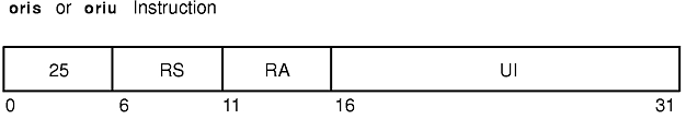 The oris and oriu instructions logically OR the contents of general-purpose register (GPR) RS with the concatenation of a 16-bit unsigned integer, UI, and x'0000' and store the result in GPR RA.