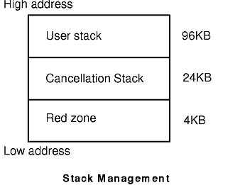 In the AIX implementation of the threads library, a chunk of data, called user thread area, is allocated for each created thread. The allocation is always a multiple of 4KB. As shown in the following figure, the area is divided into: