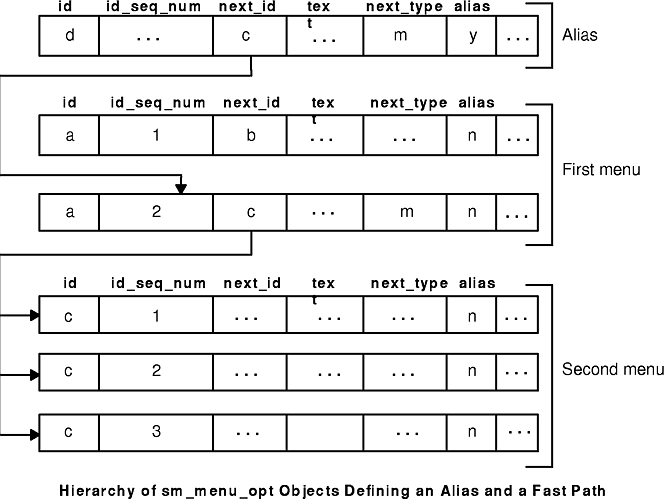 An sm_menu_opt object is used to define a fast path by setting the sm_menu_opt.alias field to "y" . In this case, the sm_menu_opt object is used exclusively to define a fast path. The new fast path or alias name is specified by the value in the sm_menu_opt.id field. The contents of the sm_menu_opt.next_id field points to another menu object, selector header object, or dialog header object, depending on whether the value of the sm_menu_opt.next_type field is "m" (menu), "n" (selector), or "d" (dialog).