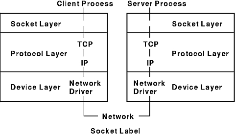 The kernel structure consists of three layers: the socket layer, the protocol layer, and the device layer. The socket layer supplies the interface between the subroutines and lower layers, the protocol layer contains the protocol modules used for communication, and the device layer contains the device drivers that control the network devices. Protocols and drivers are dynamically loadable. The Socket Label figure illustrates the relationship between the layers.