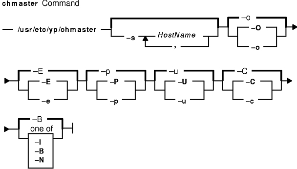 /usr/etc/yp/chmaster [ -s HostName [ , HostName ... ] ] [ -O | -o ] [ -E | -e ] [ -P | -p ] [ -U | -u ] [ -C | -c ] [ -I | -B | -N ]