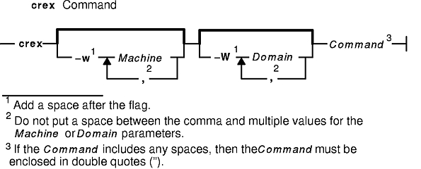 crex [ -w Machine [ ,Machine ] ... ] [ -W Domain [ ,Domain ] ... ] Command