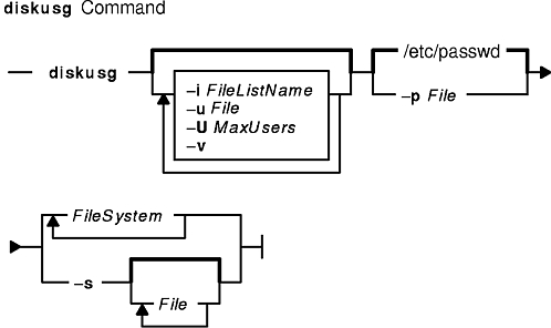 diskusg [ -U MaxUsers ] [ -i FileListName ] [ -p File ] [ -u File ] [ -v ] { -s [ File ... ] | FileSystem ... }