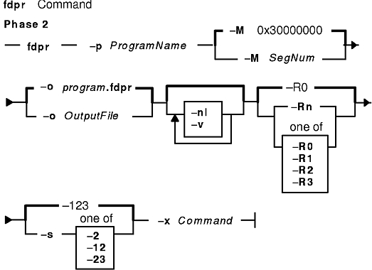 fdpr -p Program [-M Segnum ] [-o OutputFile ] [-nI ] [[-Rn ]|[-R0 |-R1 |-R2 |-R3 ]] [-v ] [-s [-2 |-12|-23] -x Command