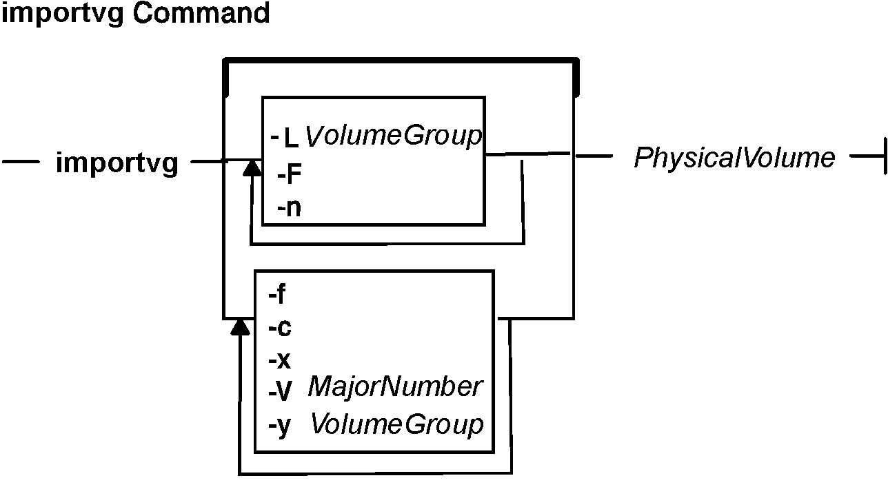 importvg [ -V MajorNumber ] [ -y VolumeGroup ] [ -f ] [ -c ] [ -x ] | [ -L VolumeGroup ] [ -n ] [ -F ] PhysicalVolume