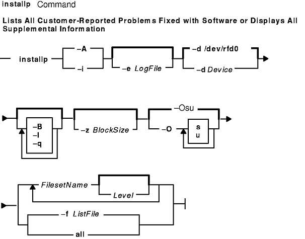 installp { -A | -i } [ -e LogFile ] [ -d Device ] [ -B ] [ -I ] [ -q ] [ -z BlockSize ] [ -O { [ s ] [ u ] } ] { FilesetName [ Level ] ... | -f ListFile | all }